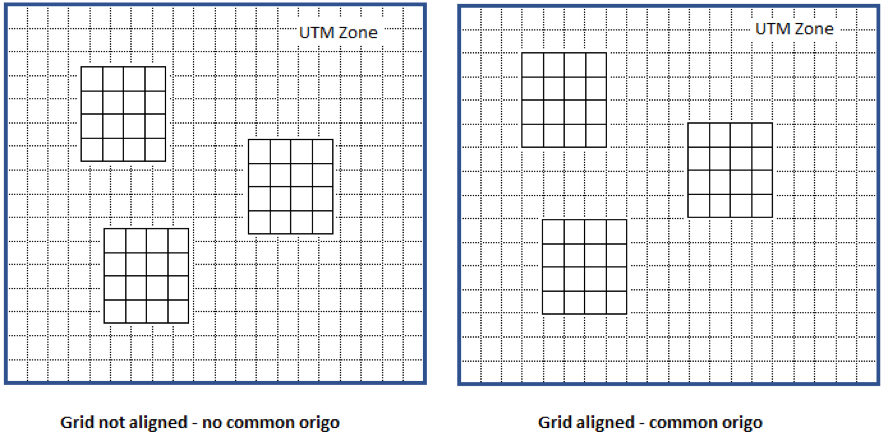 We have highlighted the benefits of producing standard aligned grids within a defined geographical area. Our intention was to implement recommendations in the standard for data product creation, outside of national predefined tiling schemes. The most important benefit being the avoidance of additional hardware calculations displaying non-aligned data together. The following figure explains visually the difference between aligned and non-aligned datasets in a UTM zone.