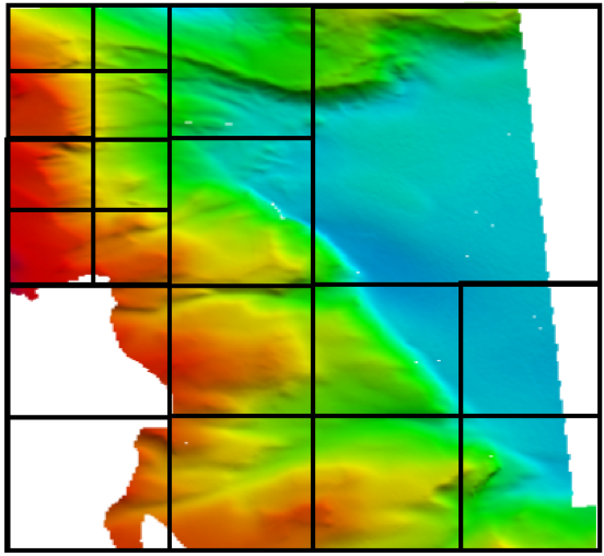 Discussions relating to multi resolution data products have been postponed for a future edition of the standard. The concept of multi resolution data products would be to allow areas within a dataset to be built of different size grid cells (see image below):