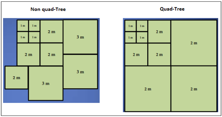 To improve the use of S-102 data when ingesting them in a terrain model, a quad-tree approach for resolution was suggested. Such an approach would affect efficient hardware processing time when moving around in a model. An example of quad-tree vs no quad -tree: