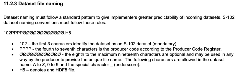 The work conducted with S-102 has been carried out in conjunction with work on other S-100 Product Specifications, especially S-101. During this work a suggestion for a common naming convention for all S-10x products was accepted. Based on our feedback this requirement has now been included in the Dataset file naming section of the new draft edition: