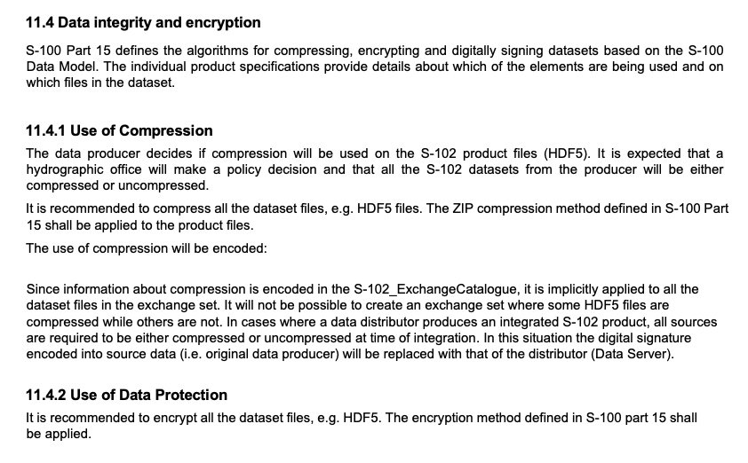 Having sufficient data integrity and encryption is an absolute necessity for trusting the data and the data delivery. An entirely new chapter has been written in S-100 on this topic, Part 15 – Encryption and Data Protection. As part of this work, data integrity and encryption has also been incorporated in the product specification. This also includes the incorporation of the necessary metadata fields for information. Based on our feedback, the following information has been included in the Data Integrity and Encryption section of the new draft edition: